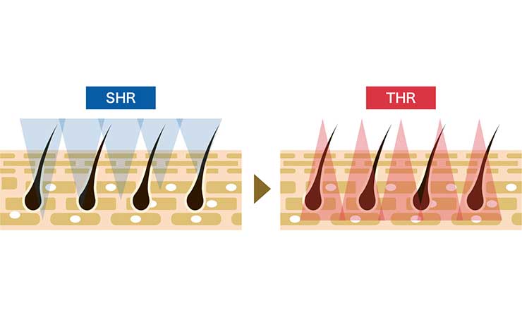 連射しても照射パワーが衰えず、高い効果を安全性を兼ね備えた「抜ける光(THR方式)」で、今までは効果が出にくかった産毛や男性のヒゲ、お子さまのデリケートな肌にも施術可能な最新の光脱毛です。
